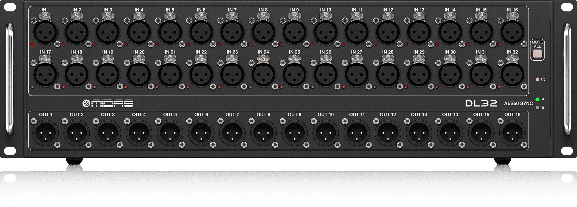 El patch digital Midas DL32 ofereix 32 preamplificadors de micròfon controlables a distància de la sèrie Midas PRO, a més de 16 retorns XLR analògics equilibrats al final de l’escenari, i tot el que es necessita és un sol cable Cat 5e.