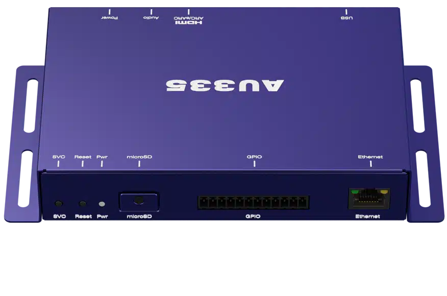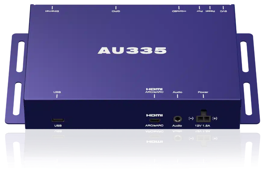 El BrightSign AU335 és un reproductor d’àudio professional per a so de fons i presentacions d’àudio interactives. El dispositiu admet fins a tres zones d’àudio mitjançant ARC, eARC i el connector estèreo de 3,5 mm. L’AU335 és compatible amb els principals formats d’àudio i es pot controlar a distància mitjançant USB, GPIO o Ethernet. També admet la transmissió de ràdio en temps real i la distribució de música de fons, i l’AU335 es pot sincronitzar amb altres reproductors BrightSign que controlen la il·luminació i altres dispositius.