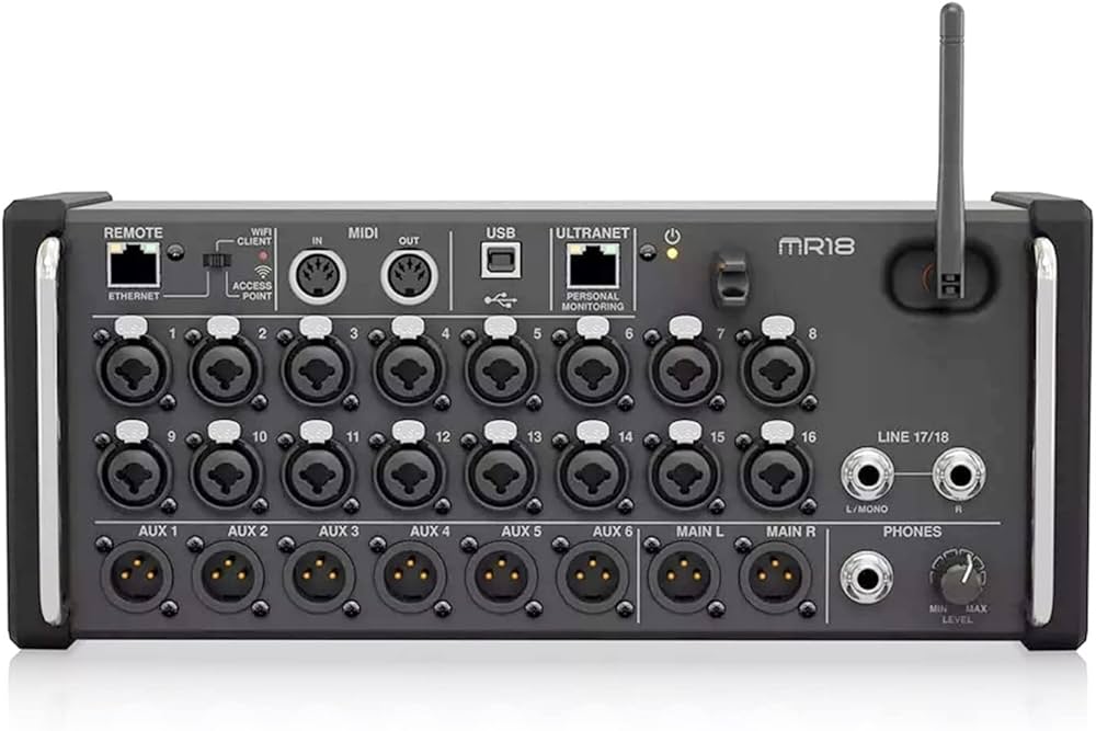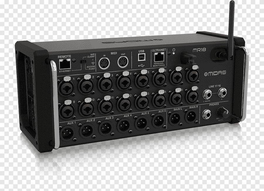 La Taula de so Midas MR18 és un mesclador digital de 18 entrades per a tauletes iPad/Android amb 16 preamplificadors Midas PRO, mòdul WiFi integrat i interfície d’àudio USB multicanal.