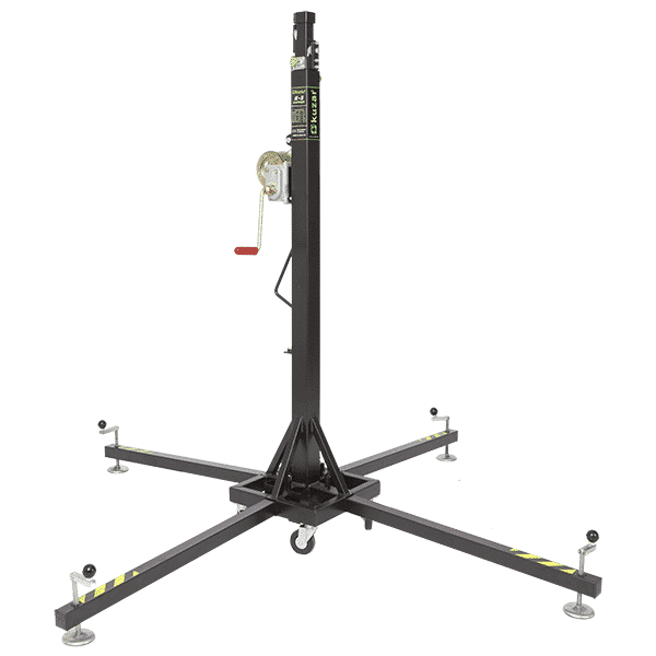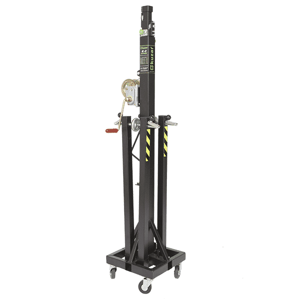La Kuzar K-3 és una torre elevadora de càrrega superior compacta, arribant a uns importants 5,35 metres d’alçada màxima. Aquesta torre també està destinada a l’elevació d’estructures lleugeres, però ja hi afegeix una base molt més robusta de perfils quadrats d’acer amb quatre rodes que fa del transport un joc de nens, munta quatre potes amb platets ajustables de goma antilliscant. La seguretat l’aporta el nostre gallet automàtic KAT que bloqueja els trams automàticament mentre eleva la torre ia més en protegeix la càrrega en el cas improbable que es trenqui el cable d’acer de Ø4mm.
